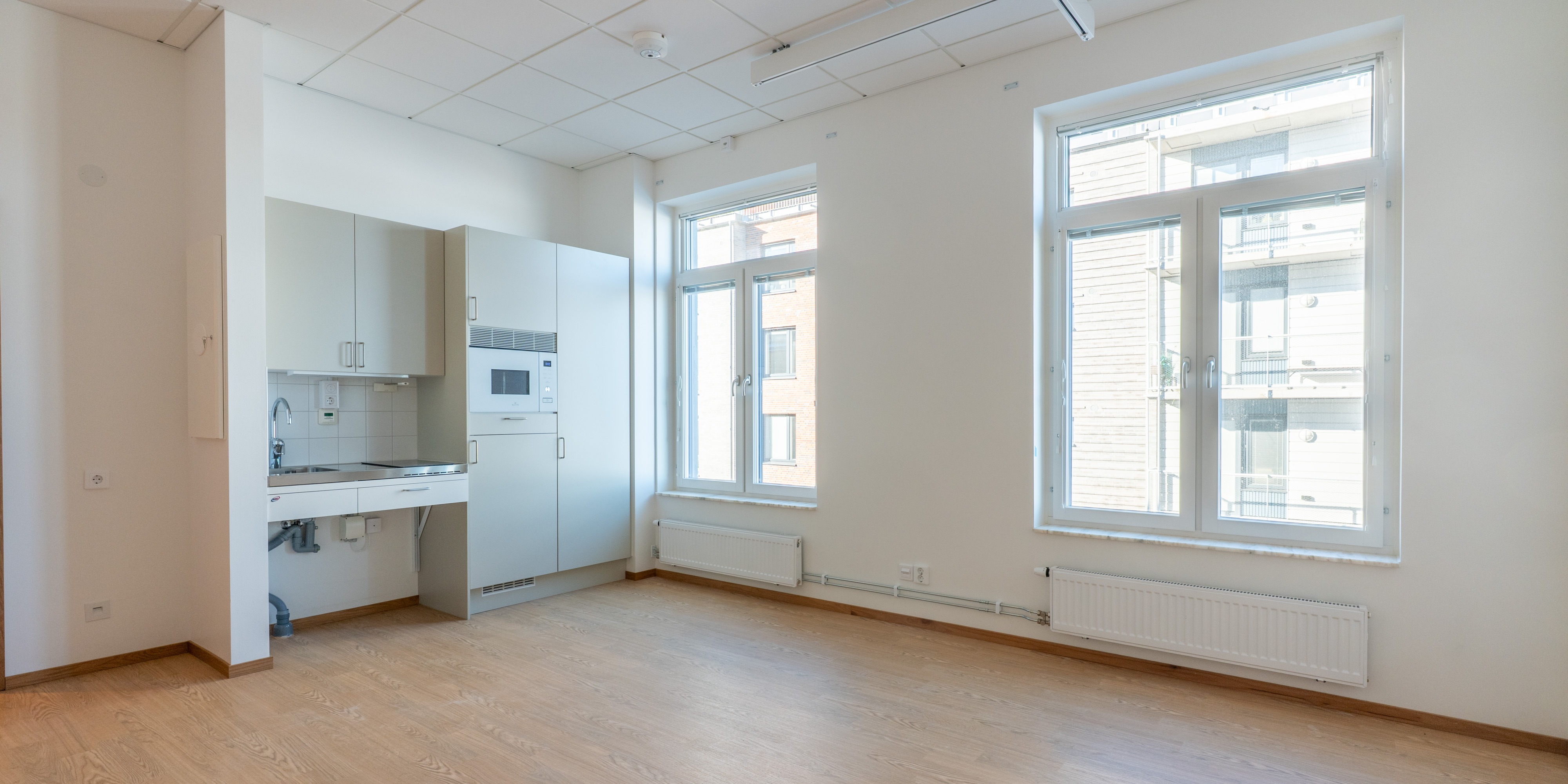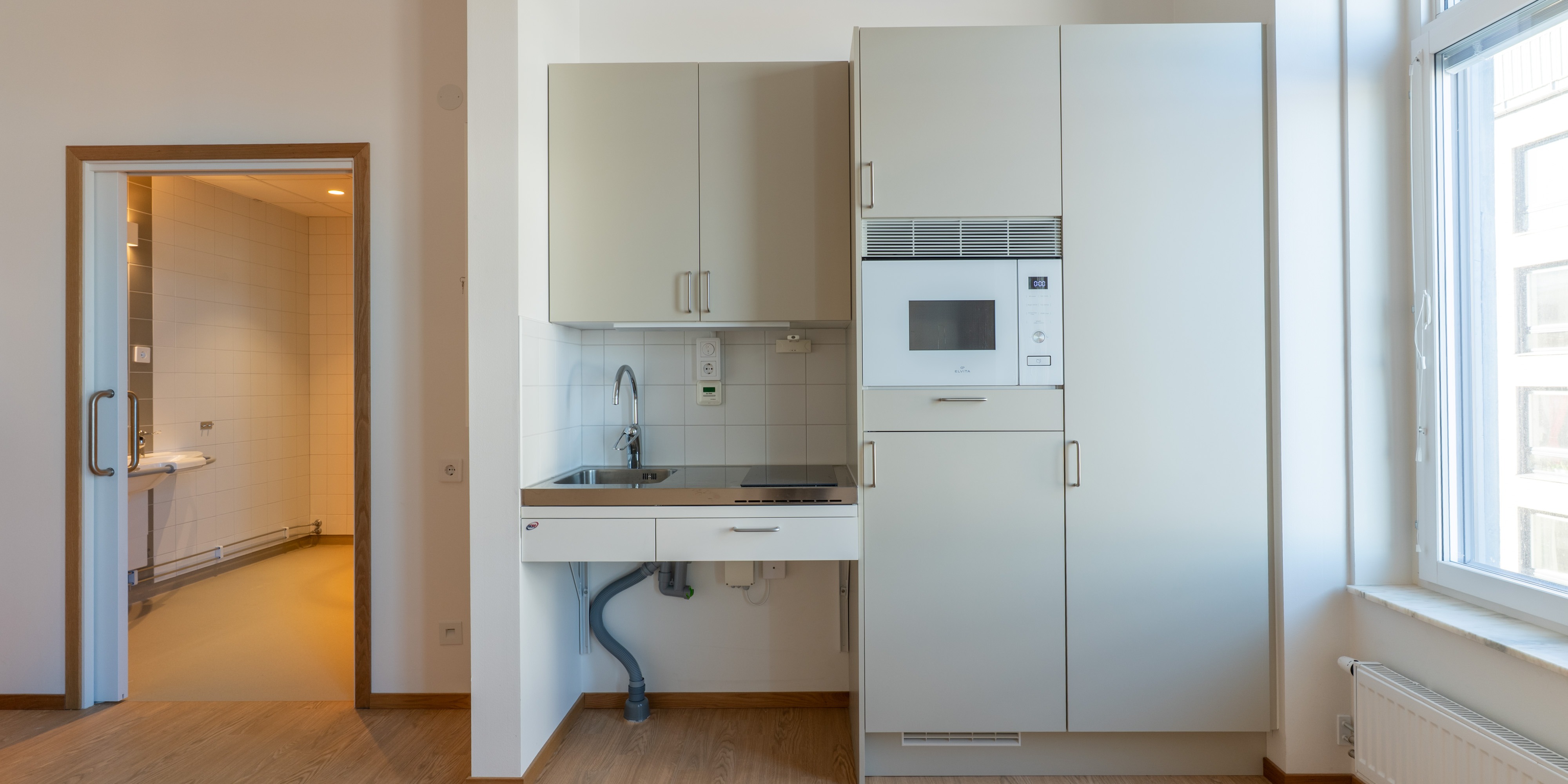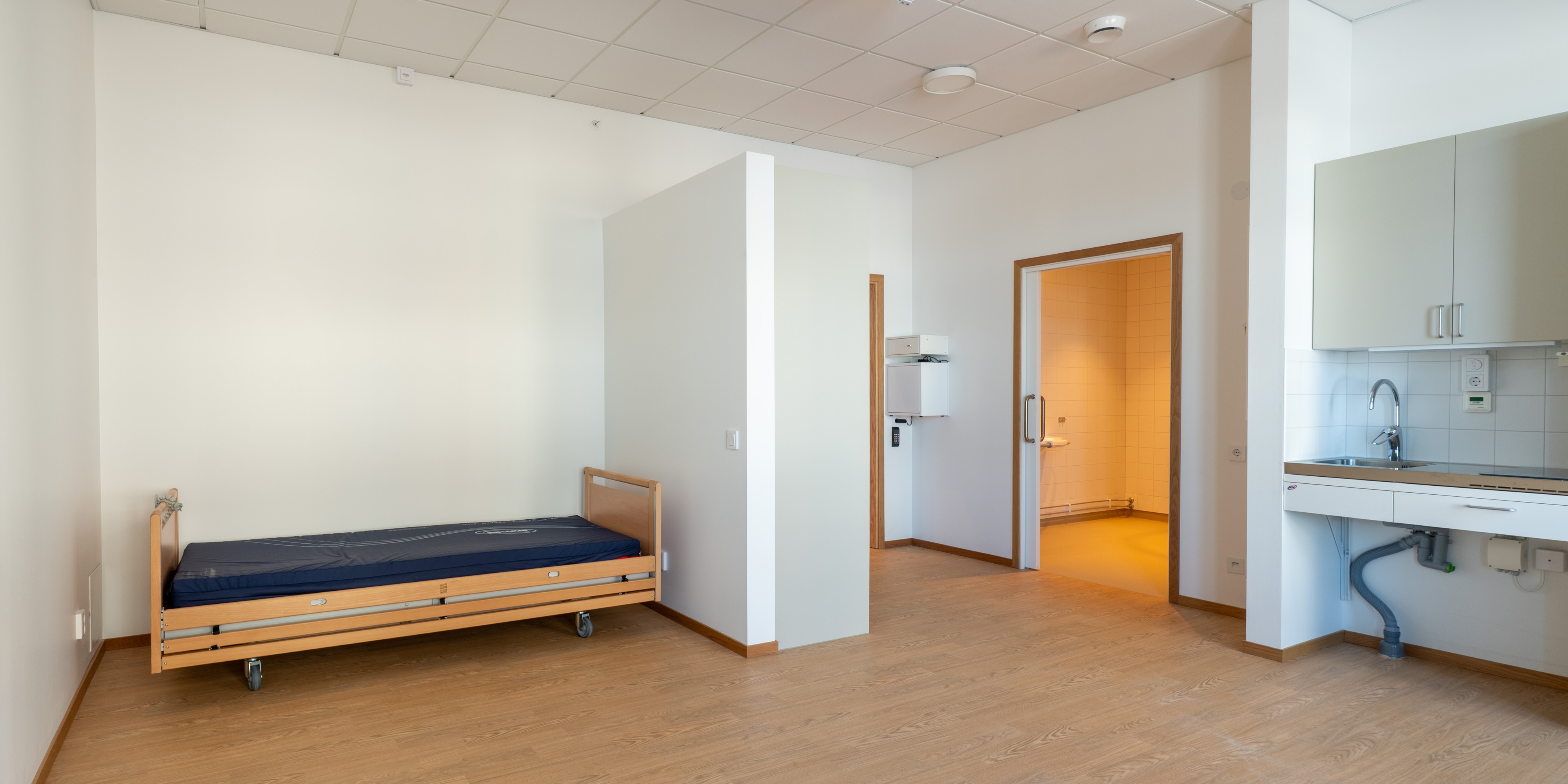 När du flyttar in finns en höj- och sänkbar säng på plats. I övrigt inreder du med dina egna möbler.