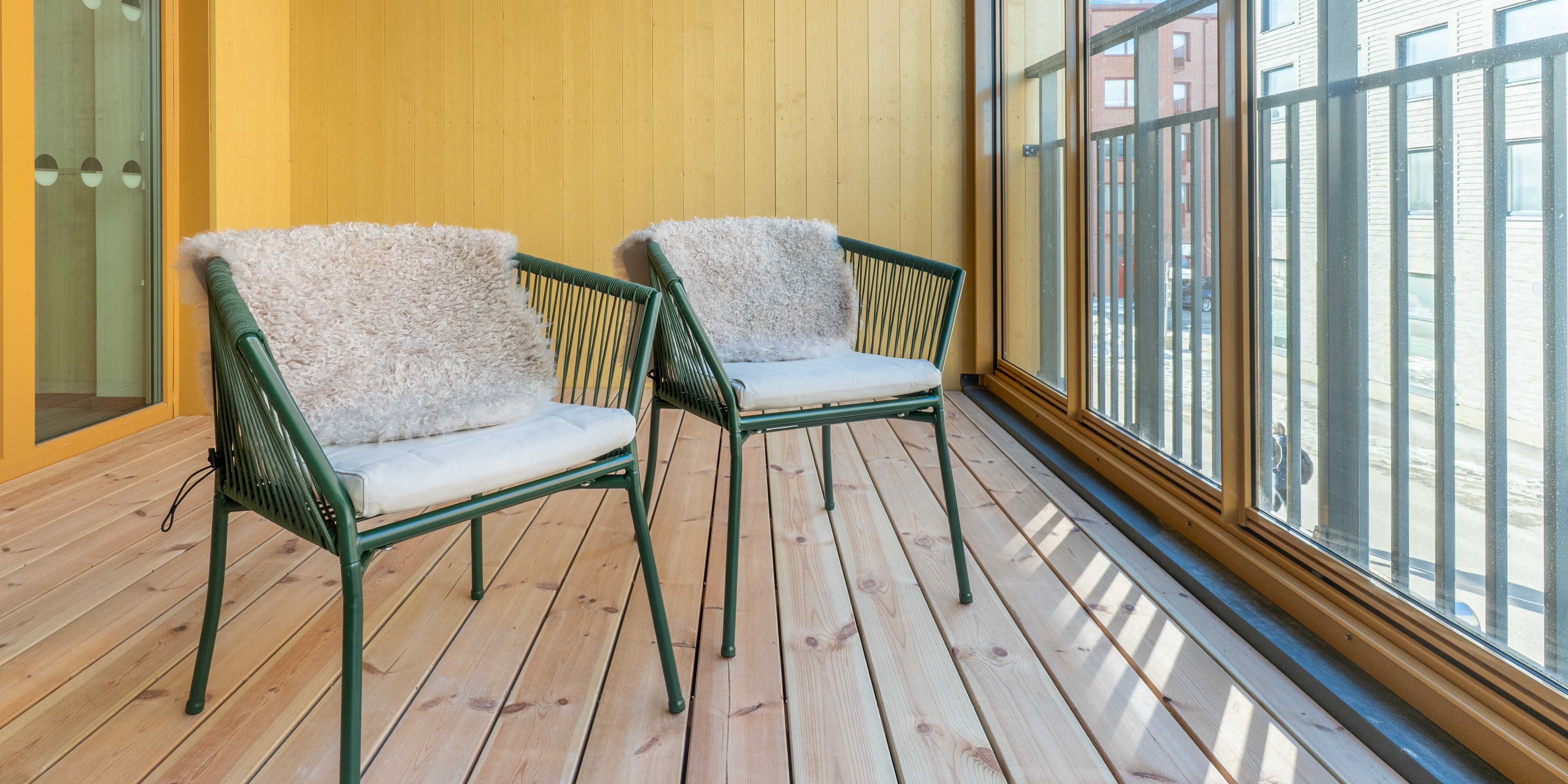 Boendet har flera inglasade balkonger i olika väderstreck.