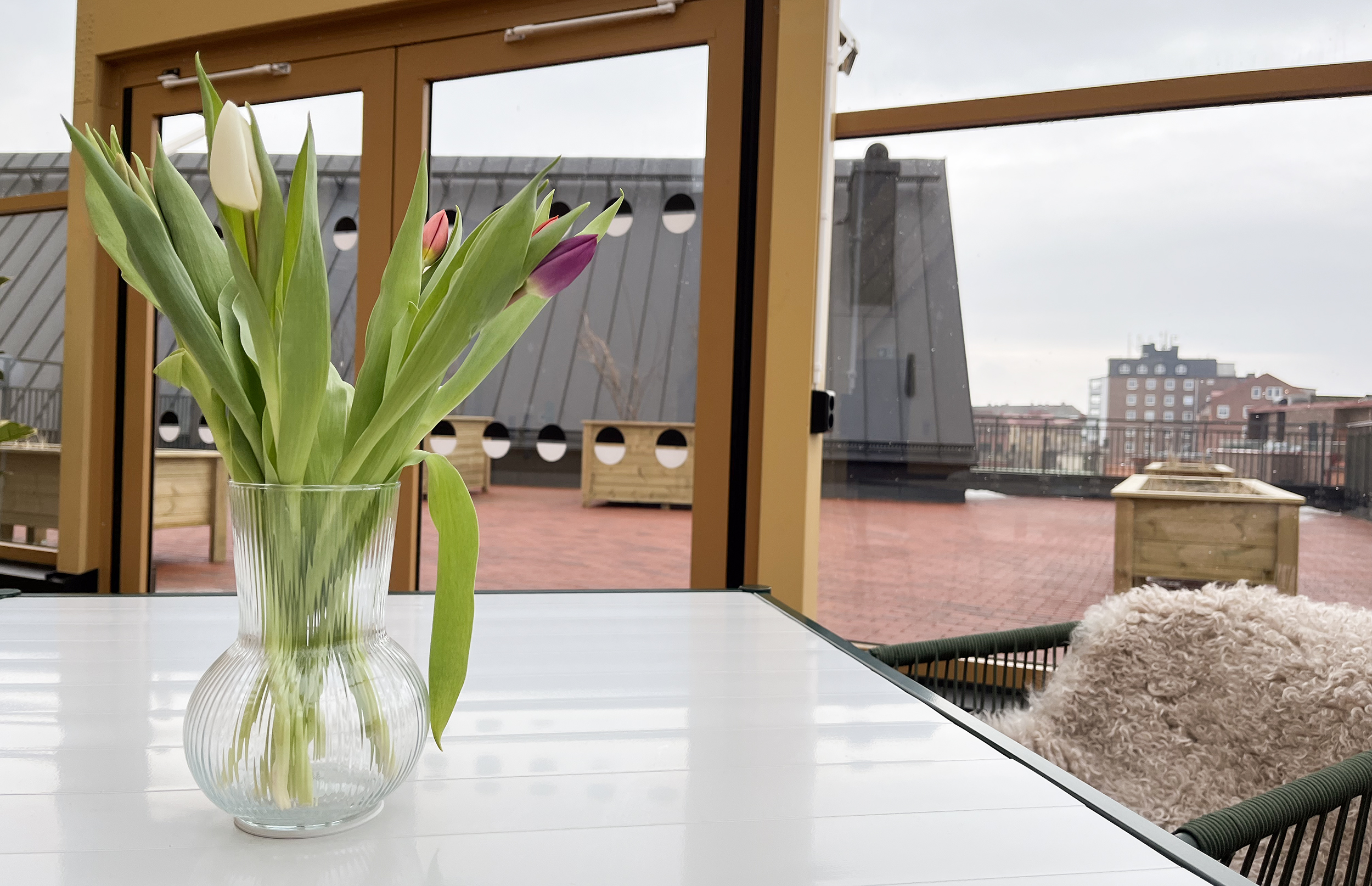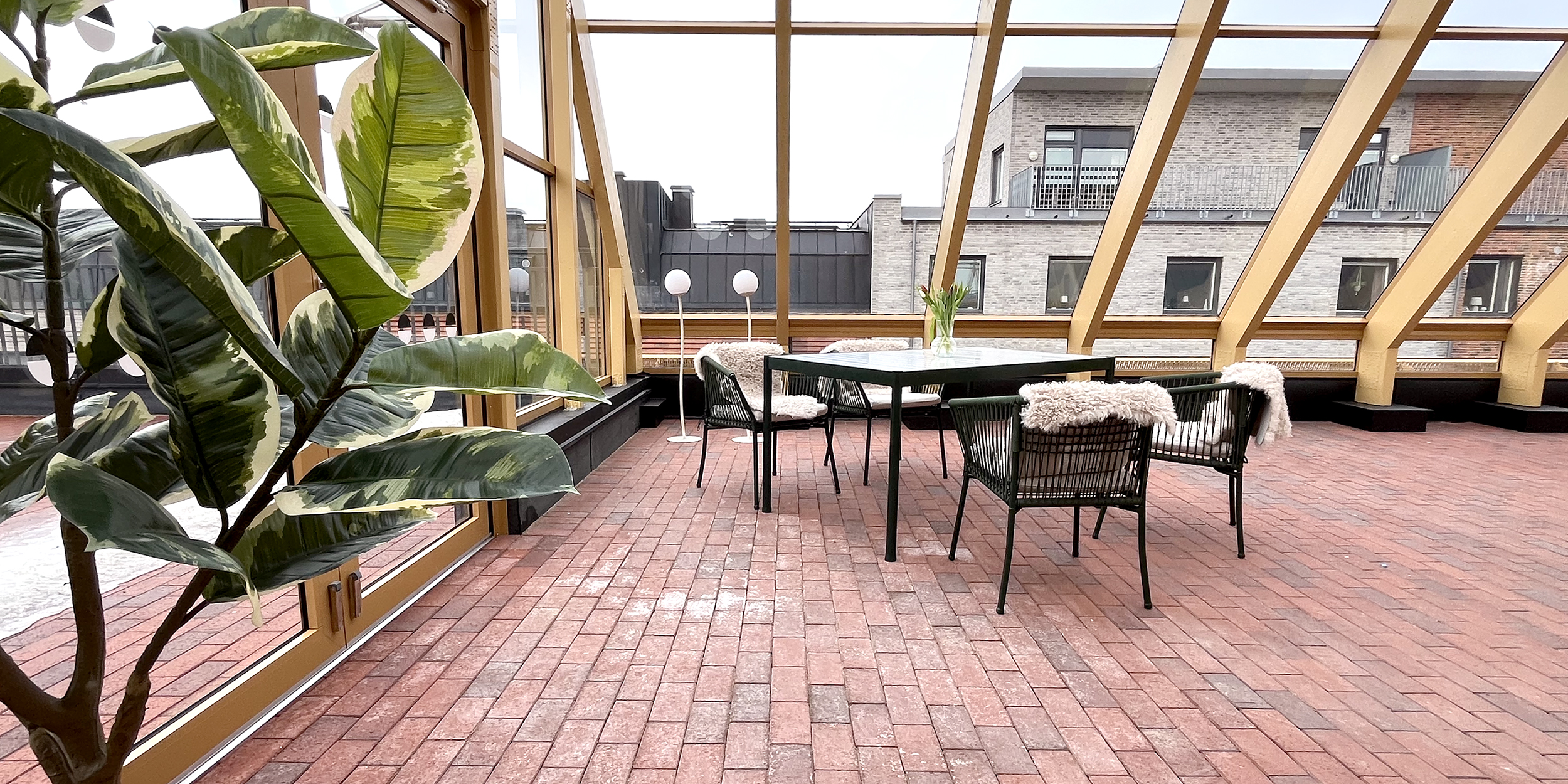 På takvåningen finns ett stort orangeri – en inglasad terrass för umgänge och fest.