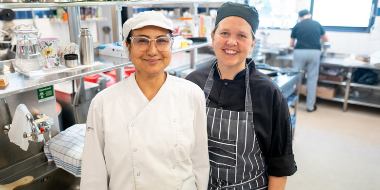 Köksassistent Mindy Duggal och köksledare Elin Paulrud på Spandelstorpskolan.