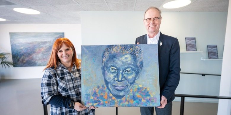 Demokratiutställningen uppmärksammar både lokalt engagemang och internationella perspektiv. Som en symbolisk inramning kompletteras den nämligen av en målning föreställande Nelson Mandela. Målningen är en gåva från Saldanha Bay – Karlskronas sydafrikanska partnerkommun som just nu är på plats med en delegation i Karlskrona.
