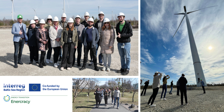 Överst till vänster: Enercracy-projektets samarbetsgrupp och representanter från Enefit Green. Foto: Kirils Gončarovs. Till höger: Enercracy-projektets konsortium tittar på Sopi-Tootsi hybridpark under studieresan i Estland. (Foto: Emil Lind).