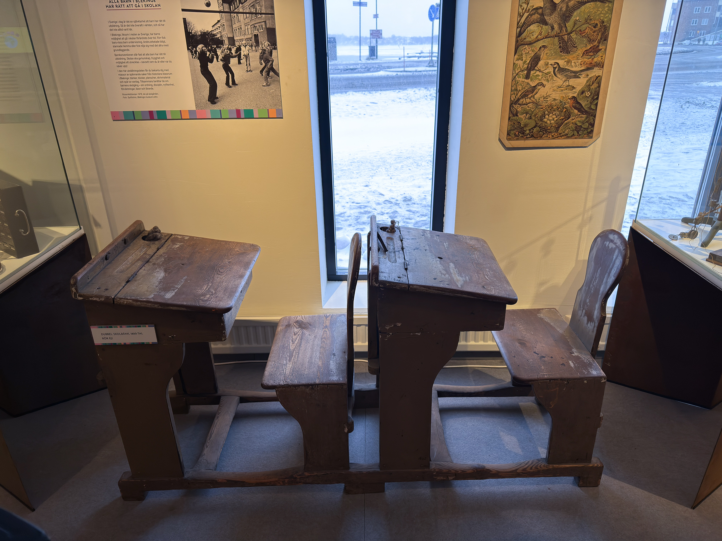 Besökarna får kliva in i ett historiskt klassrum, uppleva skolmiljöer från olika årtionden och prova på gamla prov, läxor och undervisningsmaterial. Där finns exempelvis äldre bänkar, planscher, kartor, tekniska hjälpmedel och skrivmaterial, som är hämtade direkt ur Karlskrona kommuns samling. Utställningen pågår till den 10 maj.