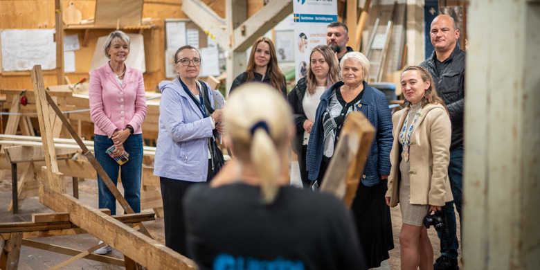 Den ukrainska delegationen besöker Litorina folkhögskolans båtbyggarlinje tillsammans med Karlskrona kommuns internationella strateg Pia Holgersson (till vänster i bilden).