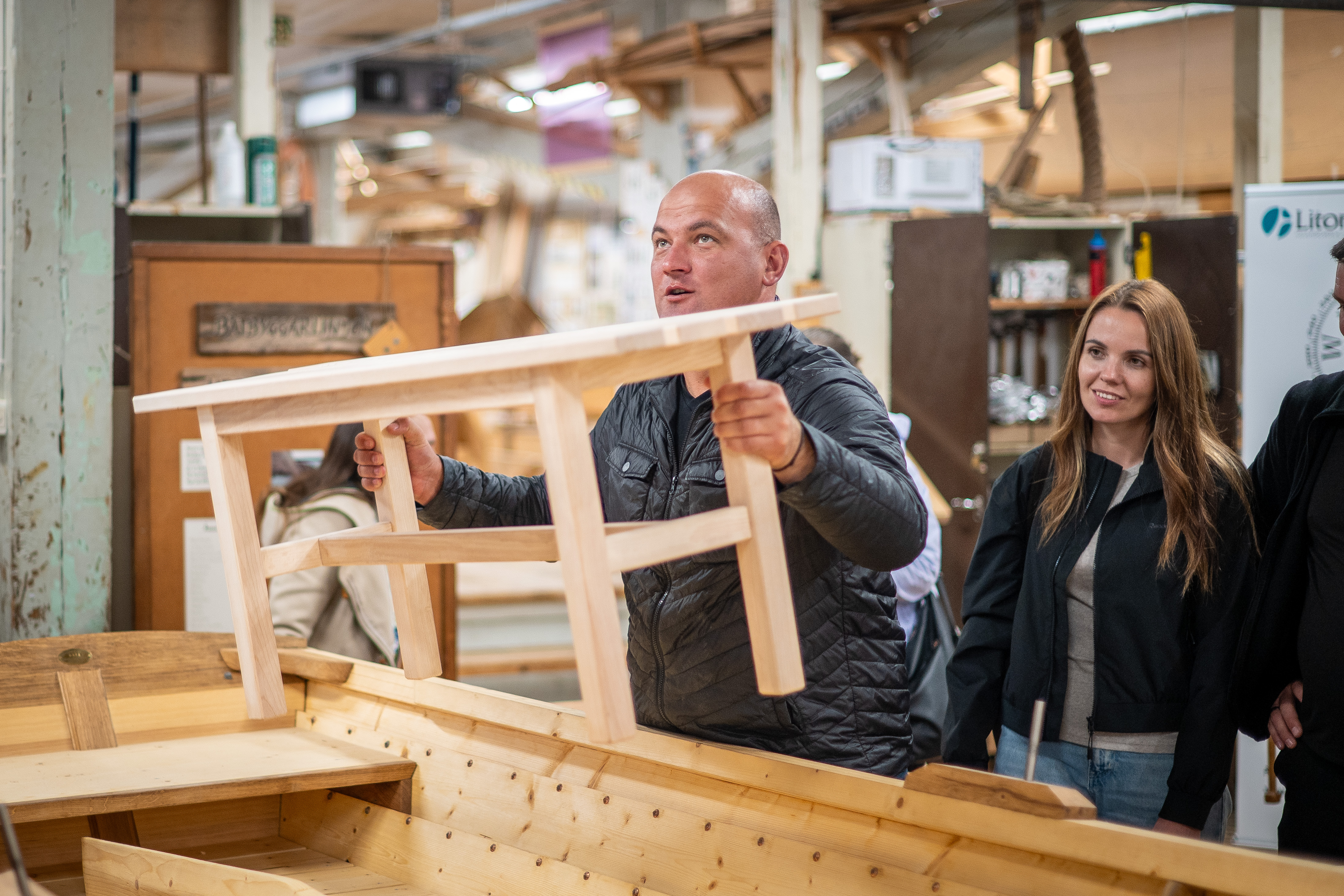 Chortkivs borgmästare Volodymyr Shmatko, Andriy Levkovych och Tetiana Manovska testar hantverksprodukter som tillverkas av spillvirke från båtbyggen.