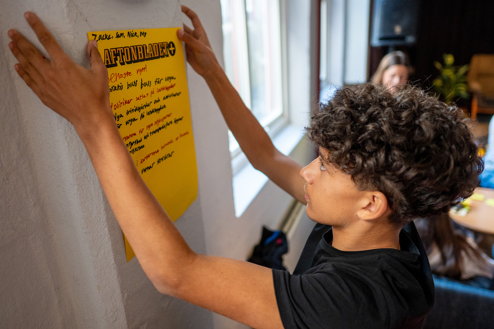 Efter träffen med politikerna följde en demokrati-workshop på temat ”Framtidens Karlskrona”. Ungdomarna fick skriva löpsedelsrubriker om hur de vill se Karlskrona tio år framåt i tiden.