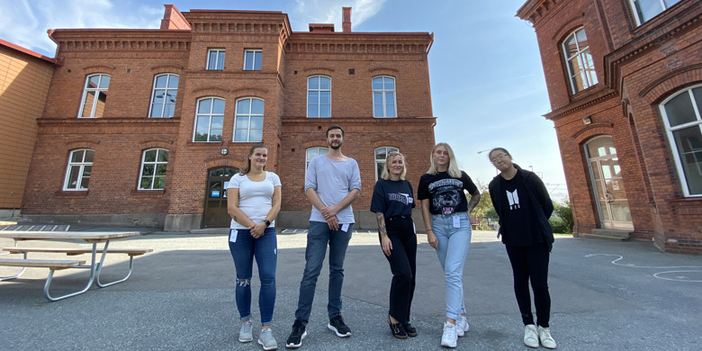 På bilden: lärarstudenterna Elina Grimström, Niclas Alm, Anny Engdahl, Elvira Andersson och Katya Ni framför Tullskolan.