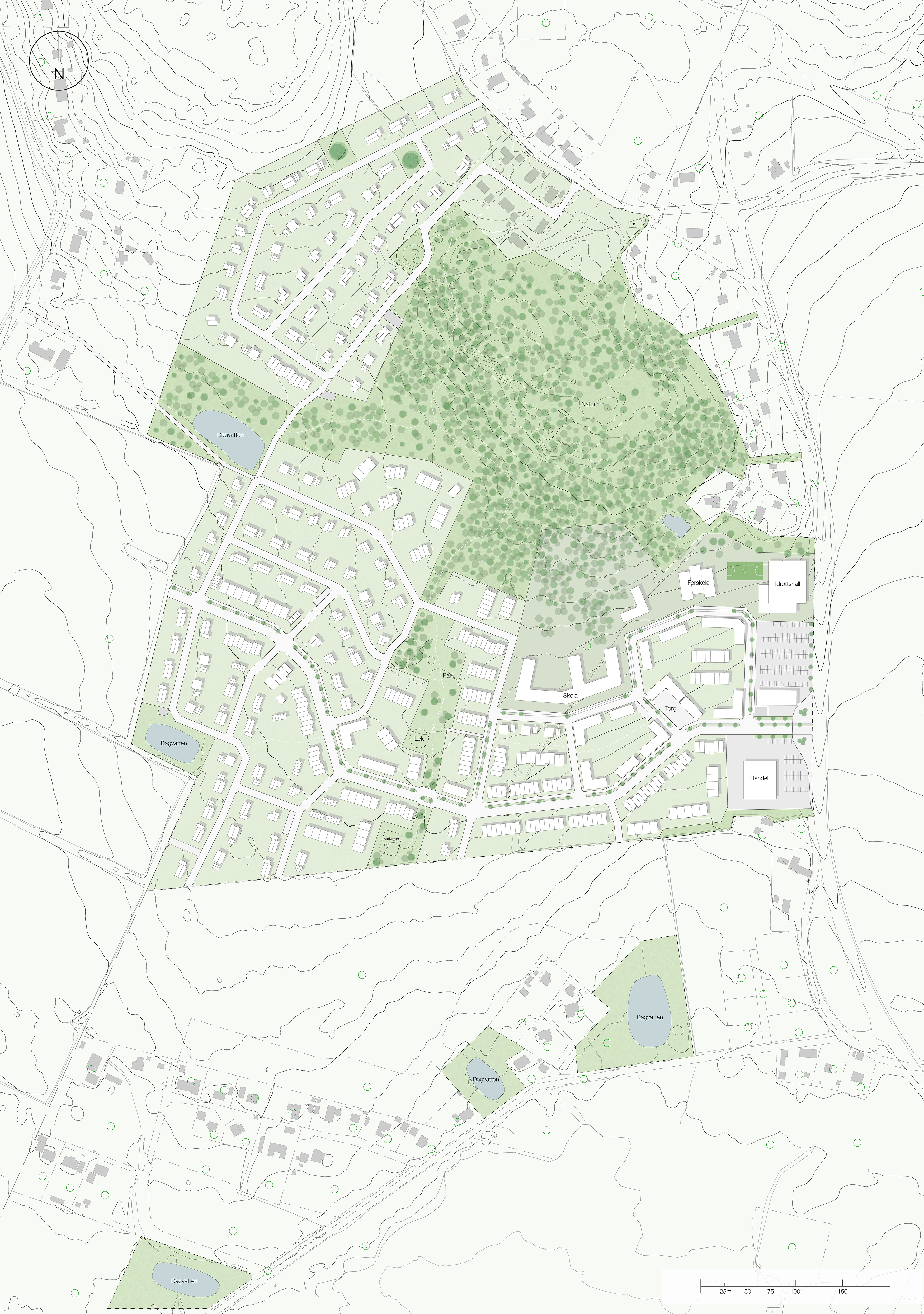 Området föreslås utvecklas med en varierad bebyggelse och planen möjliggör för flerfamiljehus, radhus, parhus och villor med högre bebyggelsetäthet i områdets östra del där skola och områden för kommersiell service placeras. De offentliga platserna föreslås utformas så att de fungerar som en förlängning av den privata tomten och kan på så vis utgöra en plats för möten för såväl boende som besökare. Bärande principer i områdets utveckling bygger på trädgårdsstadens ideal och att aktivt arbeta med ekosystemtjänster.