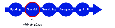 När ett första planförslag upprättats skickas det på remiss och samråd. Myndigheter, organisationer och andra remissinstanser får planförslaget för yttrande. Det ställs också ut i kommunhusets reception, på stadsbiblioteket, kommunens hemsida samt i den aktuella kommundelens bibliotek.